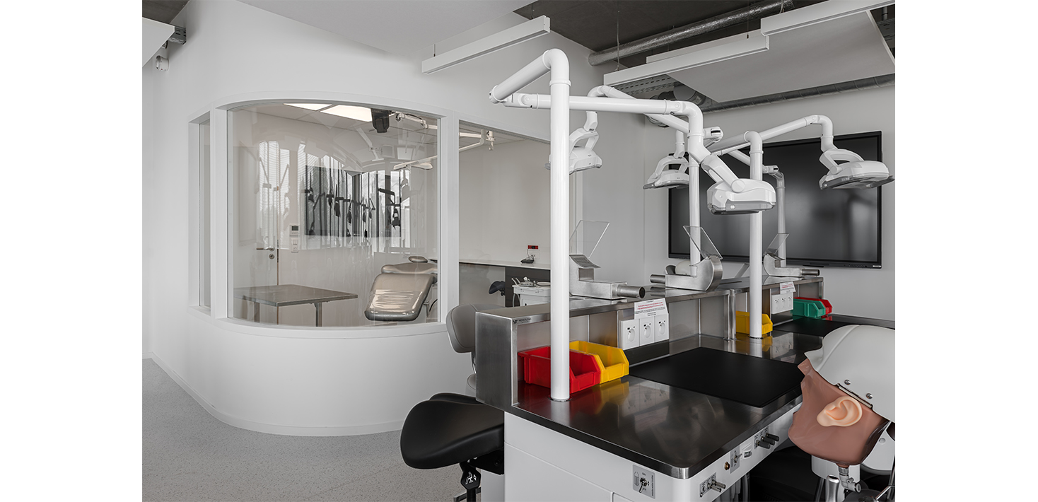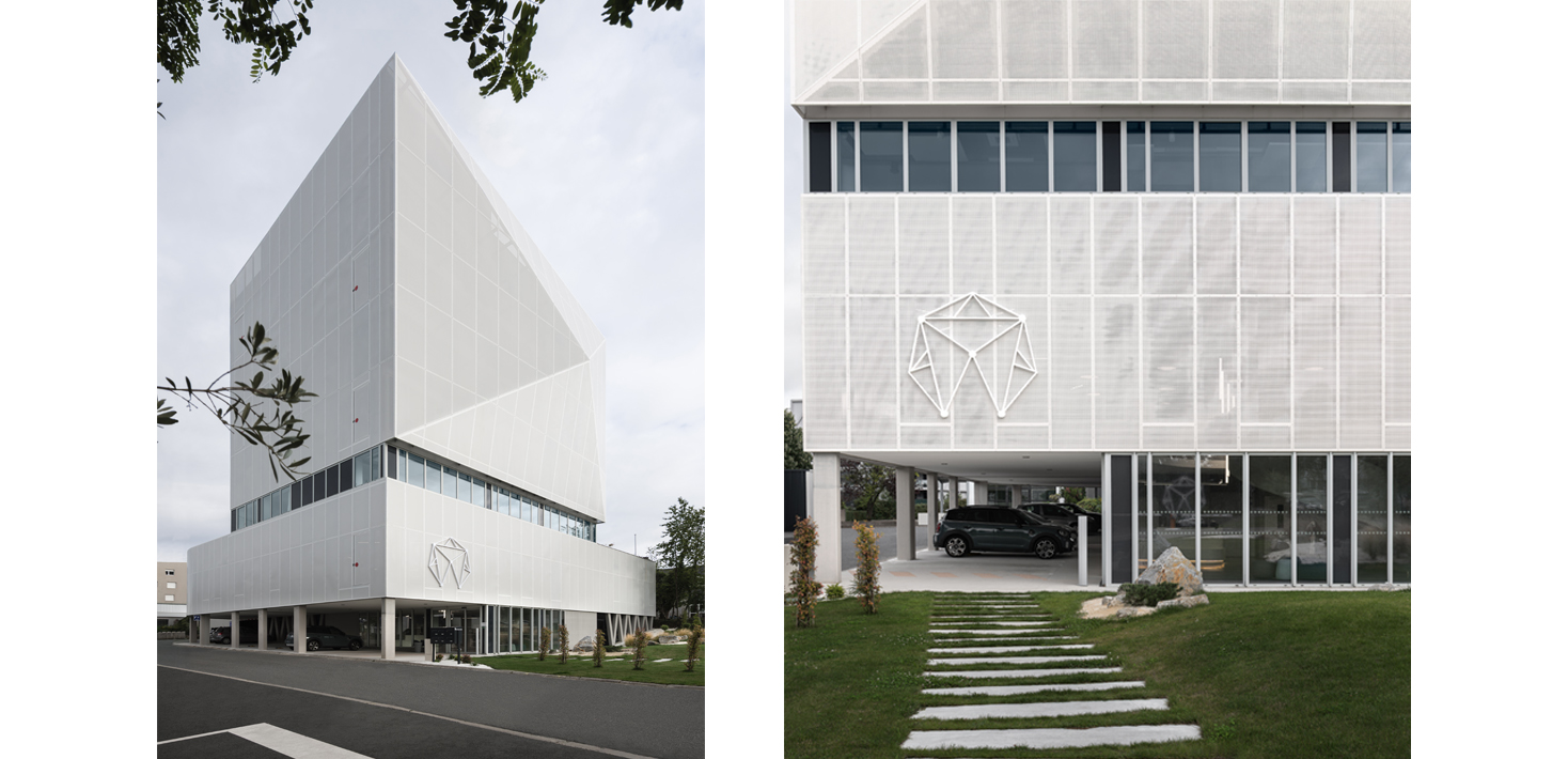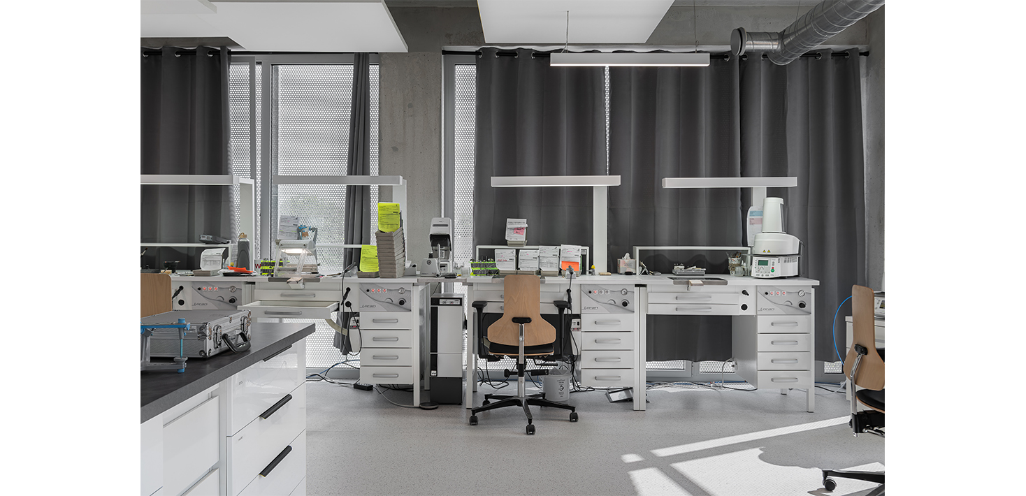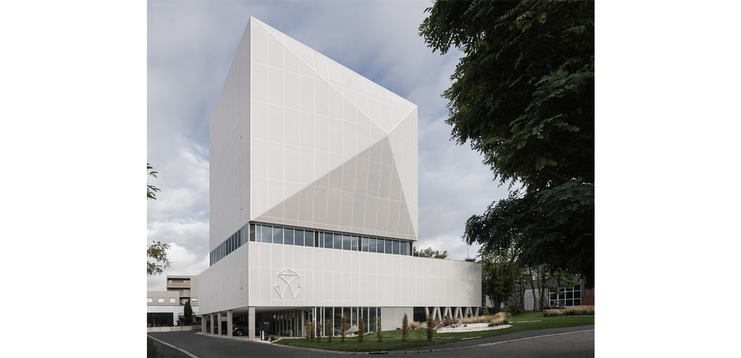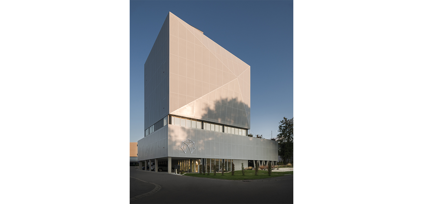 « WORKFLOW », centre de soins, de recherches et de formations, dédié au dentaire, en périphérie de Nantes présente une forte identité architecturale de par sa tour en R+7, mais aussi au travers de la double peau diaphane, en métal micro-perforé.