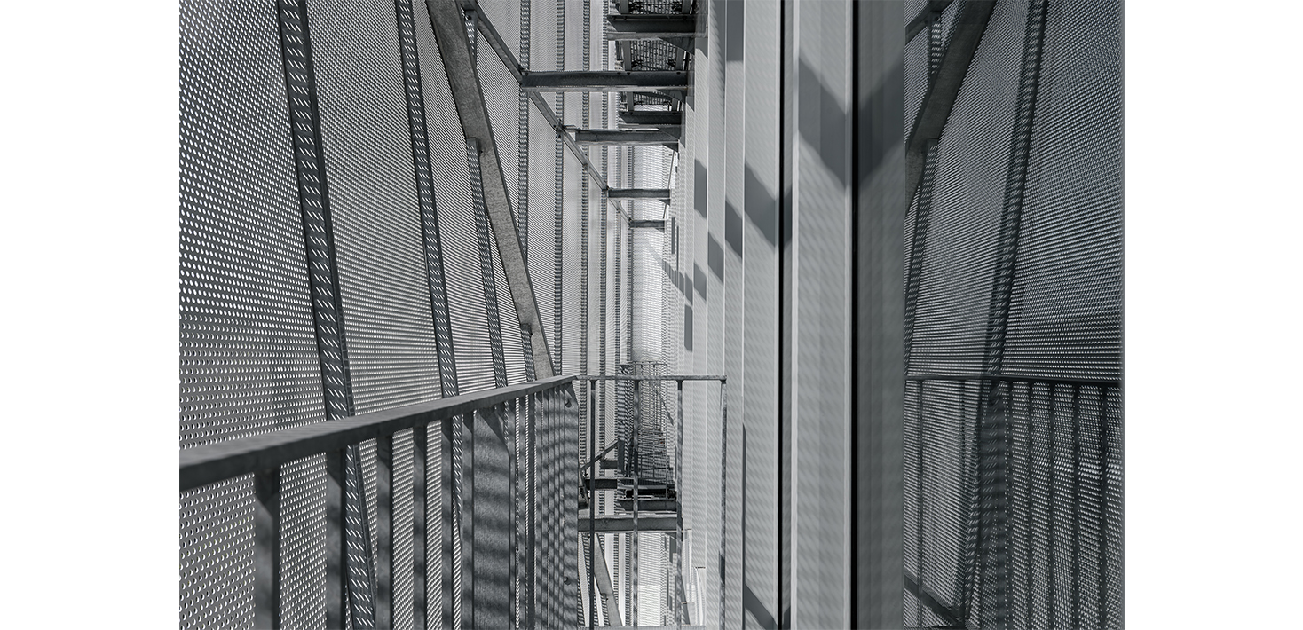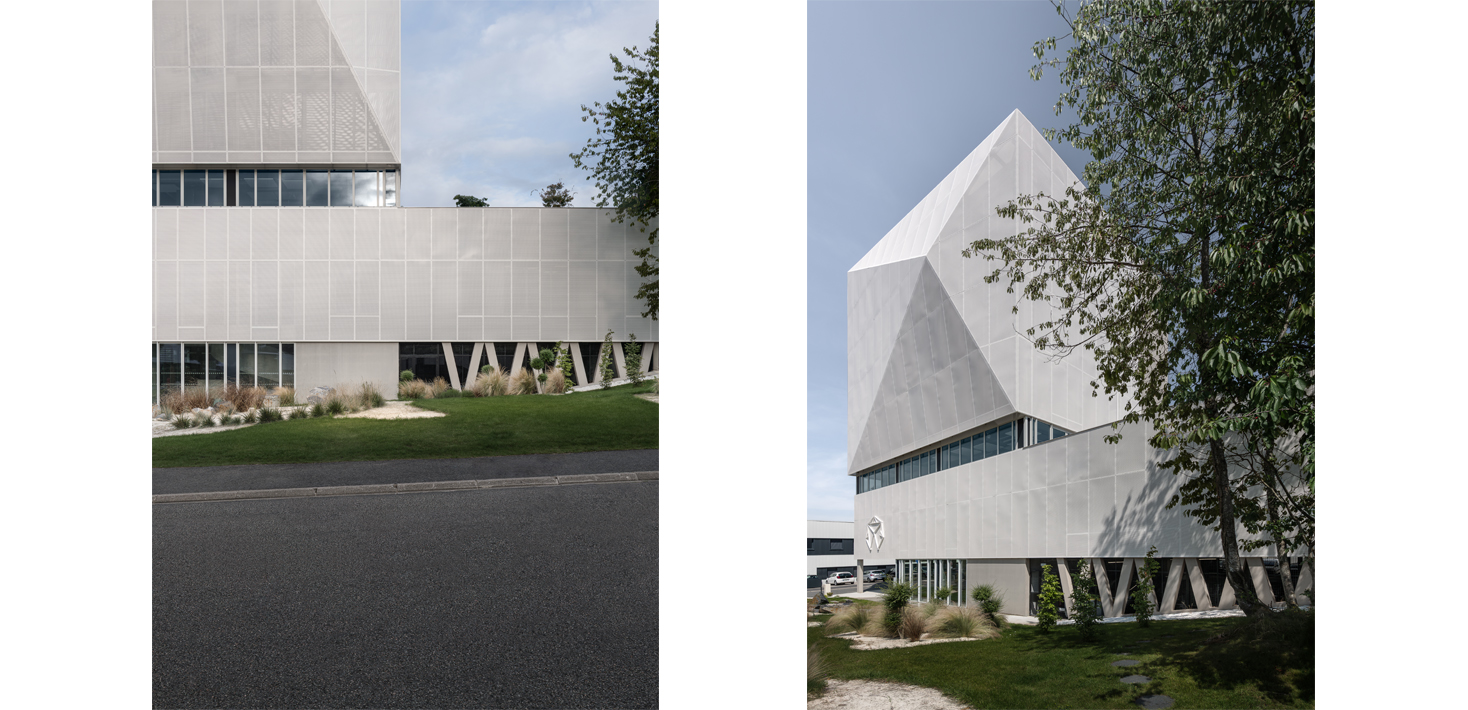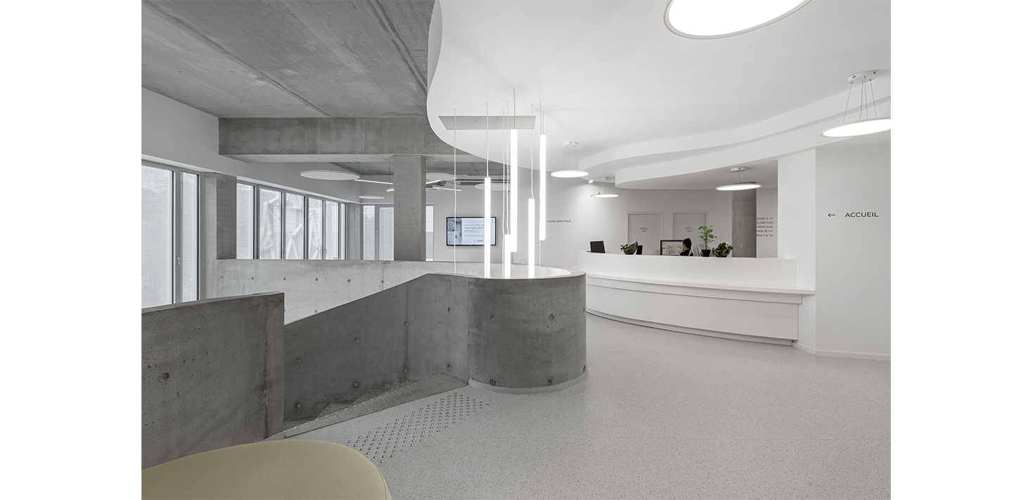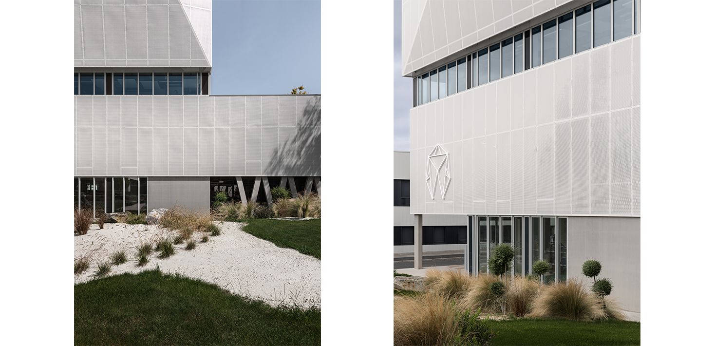 Derrière cette façade épurée et quelque peu abstraite, se cachent de réelles fonctionnalités. La peau répond à un double besoin : l’un lié à l’usage, l’autre à l’environnement proche. Elle permet, d’une part, de préserver la vue depuis l’espace public, notamment vers les espaces de soin, par l’effet moucharabié qu’elle produit et, d’autre part, propose depuis l’intérieur des espaces pleinement vitrés vers l’extérieur tout en maîtrisant les apports solaires.